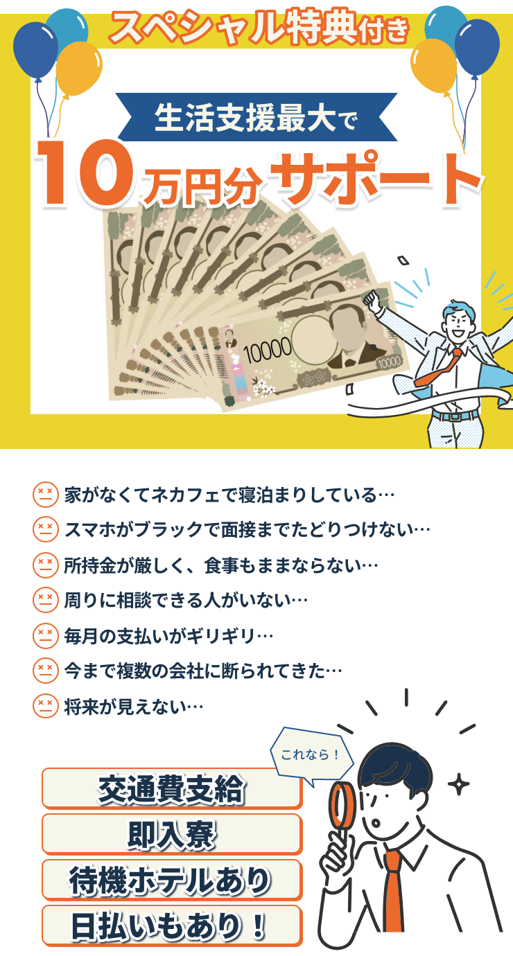 爆速ジョブ:爆速ジョブなら応募当日。提携している宿泊施設に入ることができます。所持金がなくても私たちのサポート範囲内で入ることが可能です!